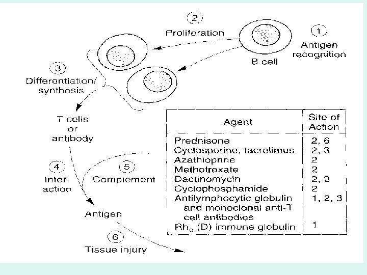 B) Lymphocyte Depletion Agents • 1. Corticosteroids • The most commonly used immunosuppressant • MOA: – At biochemical level: act on gene expression, which lead to decrease synthesis of PGs; LKTs; cytokines and other signaling molecules that participate in immune response. – At the cellular level: they inhibit the proliferation of T lymphocytes (cell mediated) and slightly dampen humoral immunity (by increasing the catabolism of immunoglobulins). – At immunosuppressive doses, Corticosteroids are cytotoxic and continuous uses lowers Ig. G.