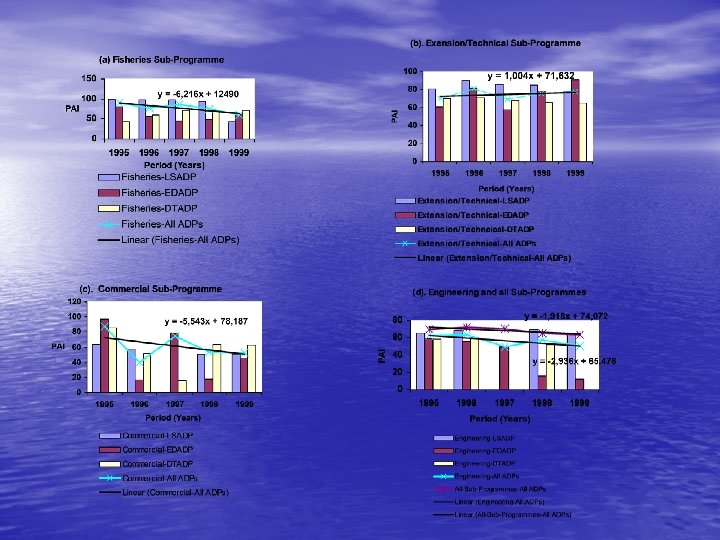 Summary of Results and Discussion • 1. - The ADPs Activities The Transfer of Modern Fish Farming Practices is vested on the fisheries, extension and technical sub- programmes. Fisheries consist of – the adaptive research/technology, brood-stock development and fingerling production. Extension and Technical consist of – the no. of farm families covered, no. of VEAs employed, no. of Small Plot Adoption Techniques established on the farmers’ farms, On-farm Adaptive Research trials conducted, farmers group established, no. of fish farms visited, the regular conduct of Fortnight and the Monthly Technical Review Meetings. 2. Fish Farming Inputs Procurement, Distribution and Supply is vested on the commercial for 3. Rural Infrastructure and Community Development is vested on the Engineering for constructing and procuring, distributing and supplying the farmer fertilizer, agro-chemicals and lime, insects/pesticides sprayers and water pumps, hiring of farm implements and tools, the formation and support of farmers’ groups and the linkage of the farmers to credit institutions and facilities. maintaining rural feeder roads, provision of rural water, establishing farm training/service centre/store and construction of demonstration fish ponds. The distribution of the physical targets and their achievements for the above activities except for mainly extension sub- programme shows, consistently lower than the physical targets set and both have also been on a declining trend through the period 1995 -1999 as shown in the graphs. The Commercial and Engineering were specially affected by re- organisation of the ADPs activities. • Also, sharp decrease was recorded for the time period immediately preceding 1997 or immediately thereafter. This period refers to the time before and after the provision of the so-called World Bank ‘bridging loans’ to the ADPs.