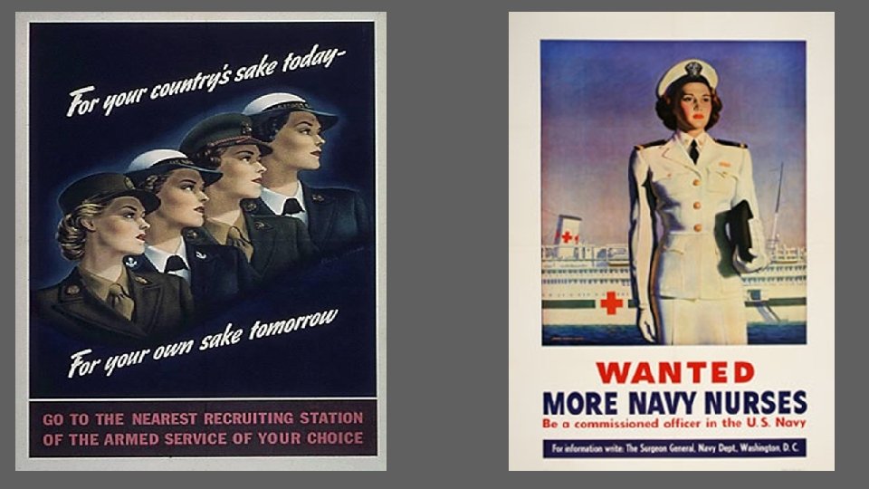 WOMEN IN THE ARMED FORCES 216, 000 enlisted for non-combat duties WAC’s – Women’s Army Auxiliary Corps WAVES– Women Accepted for Volunteer Emergency Service (Navy) SPARS– U. S. Coast Guard WASPS– Women’s Airforce Service Pilots More than 1000 served First women to fly military aircraft Did not receive full military status until 1977