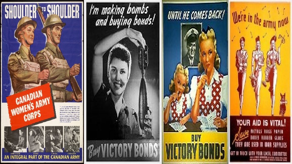 WOMEN When war broke out, men and women volunteered for service but due to the gender roles and environment in Canada, men had a much higher enlistment number than women. Women were asked to replace men in civilian jobs when they went off to war In colleges throughout Canada, women stopped attending classes on “knitting” and started doing their part in driving Red Cross trucks By 1944, 30% of non-agricultural workers were women By the end of the war, the question was would women leave the men’s workplace quietly and happily—some did, some did not.
