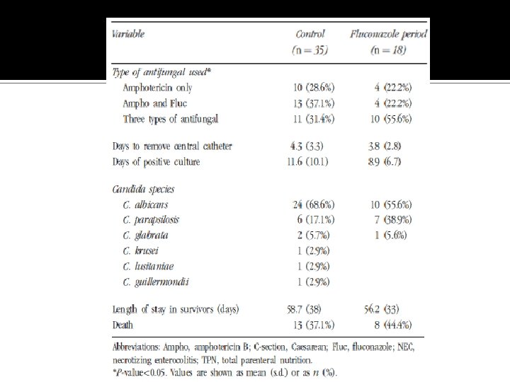 Resultados – Profilaxia com fluconazol A bilirrubina direta elevada foi observada nas 6 primeiras semanas em 22 lactentes: - Covariáveis significativas foram: idade gestacional (OR 1, 44; IC 95% 1, 06 -1, 96, P<0, 02) e menor duração de antibióticos (OR 0, 91, IC 95% 0, 85 -0, 97, P < 0, 006) O risco de insuficiência hepática (n = 22) tendeu a ser menor que naqueles sem ECN definida (OR 0, 26, IC 95% 0, 06 -1, 08, P<0, 06). Alteração renal (n = 83) e trombocitopenia (n = 120) foram significativamente associadas com menor idade gestacional (OR 2, 05, IC 95% 1, 62 -2, 6, P<0, 0001 e OR 1, 16, IC 95% 1, 04 -1, 29, P<0, 006).