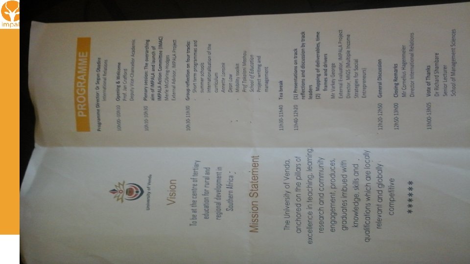 In spite of Changes in SA University management- Limpopo Hlulani leaves. Jabu takes over: . Finance up to date. Assists UFH. Coordinates All IMPALA activities. Are only two in the office. COIL room identified. Goes beyond duty.