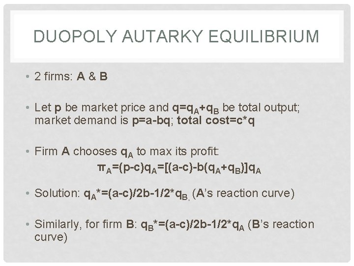 DUOPOLY AUTARKY EQUILIBRIUM • 2 firms: A & B • Let p be market price and q=q. A+q. B be total output; market demand is p=a-bq; total cost=c*q • Firm A chooses q. A to max its profit: πA=(p-c)q. A=[(a-c)-b(q. A+q. B)]q. A • Solution: q. A*=(a-c)/2 b-1/2*q. B, (A’s reaction curve) • Similarly, for firm B: q. B*=(a-c)/2 b-1/2*q. A (B’s reaction curve)