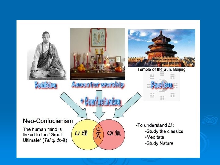 Tang cont. Significantly expanded China and its influence. Regained western lands in Central Asia and influence over other states like Korea and contact with Japan increased (they sent scholars). Ø New contact with new states and cultures helped spread trade and strengthen their economy. Ø Buddhism well established even emperors were Buddhist. Missionaries were sent to other Asian lands. Ø Age of Buddhism 400 -845 until its popularity was seen as a threat. Ø A campaign was started to hurt it and they burnt texts. Ø Buddhism survived but combined with Daoism and Confuscianism. Ø Ø