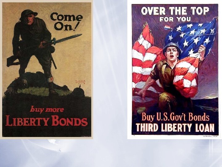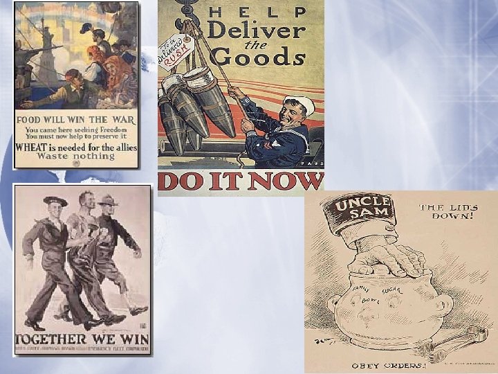 CPI Continued Creel and the CPI conducted the greatest sales job ever! Governments were left to find ways to make the war popular for their citizens- besides songs they also used art. Propaganda posters were widespread and targeted all sorts of groups. Effects of CPI- new policies Work or Fight! “Sweetless, Meatless, Wheatless, and Heatless” Victory Gardens