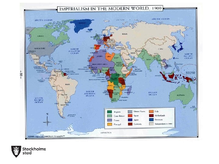 Hur ska man förklara denna iver att lägga under sig områden på andra sidan haven? Här är de vanligaste förklaringarna: • Den växande industrin i Europa behövde råvaror och nya marknader för sina varor. • Motsättningar mellan Europas stormakter ökade i slutet av 1800 talet. Att skaffa områden i främmande världsdelar var ett sätt att visa makt och styrka. • Européerna ansåg att de stod för en högre kultur som de hade ansvar att sprida till så många som möjligt. • Ett viktigt inslag i denna kultur var kristendomen. Det gick lättare att sprida kristendomen i områden om européerna hade erövrat. • De europeiska ledarna hade visat sin duglighet och styrka. Därför ansåg de sig ha rätt att lägga under sig svagare länder och områden.