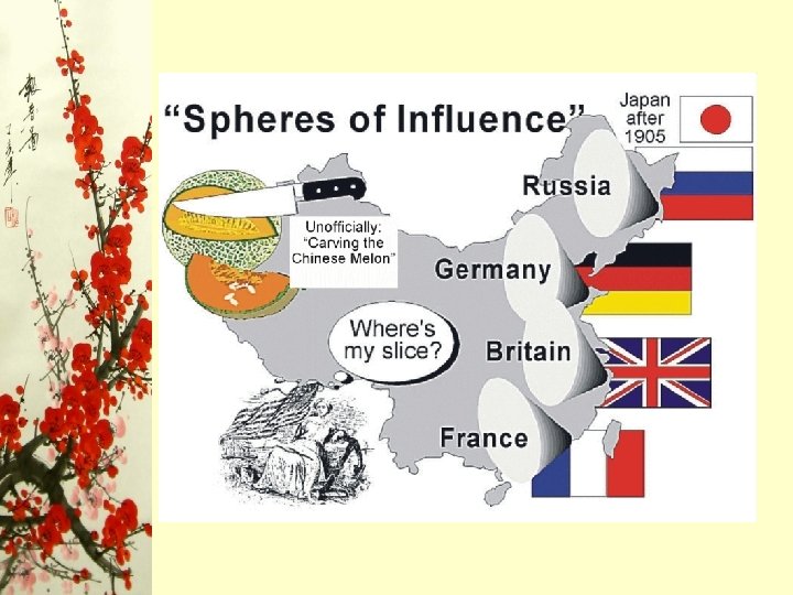 Which countries? • Japan – Korea, Taiwan, southern Manchuria • France – Vietnam, railroad to Indochina • Germany – Mining rights, railroad • Britain – Trade routes in Yangtze valley, naval base • Russia – Indemnity, tax free route for railroad