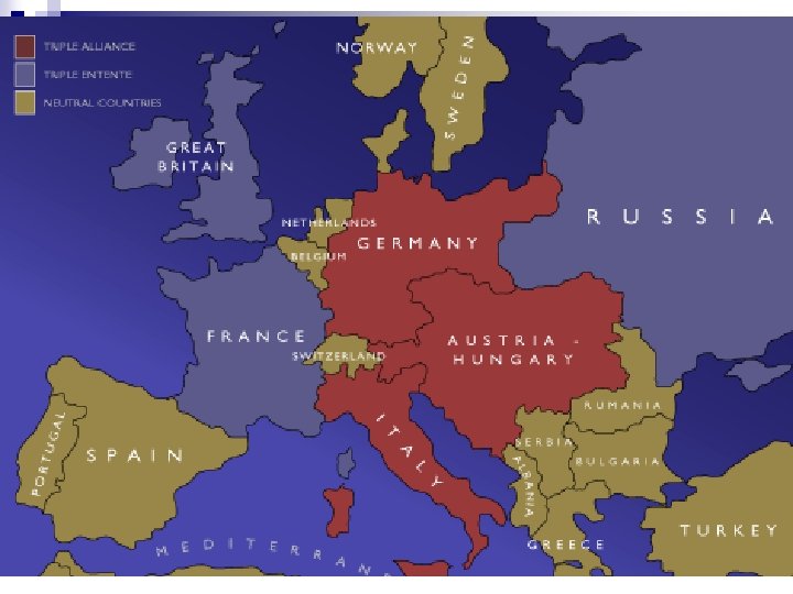 Política Armamentista – Alianças “Paz Armada” • Tríplice Entente – Inglaterra – França – Rússia “Aliados” + EUA, Brasil, . . . • Tríplice Aliança – Alemanha – Império Austrohúngaro – Itália* “Potências Centrais” + Império Turco. Otomano, Bulgária. . .