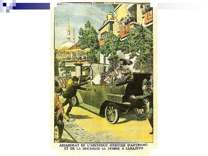 1914 → Sarajevo = assassinato do herdeiro do trono Austro-húngaro *Estopim* (nacionalista sérvio) • Imp. Austro-Húngaro exige a apuração do fato, Sérvia recusa • Imp. Austro-húngaro declara guerra à Sérvia, aliada da Rússia • Política de alianças leva à Guerra Mundial (Itália mantém-se neutra)