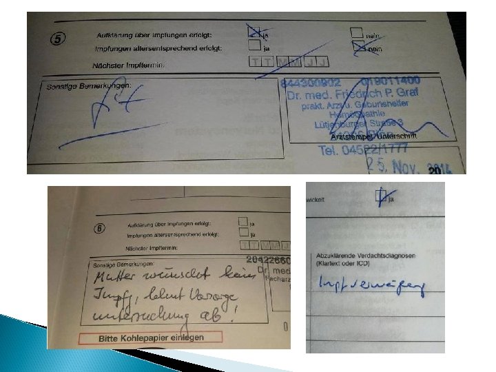 Was geschieht tatsächlich? � � Injektion in Muskelgewebe bzw. Blutbahn alle Abwehrbarrieren, wie man sie in Haut, Schleimhaut, Mandeln, Magensäure, lymphatischem Gewebe des Darmtraktes, Leber, u. v. m. findet, werden dadurch umgangen. solche "Verletzungen" kommen in der Natur nicht vor Titer reagiert auf Gifte! => Überforderung des Körpers!