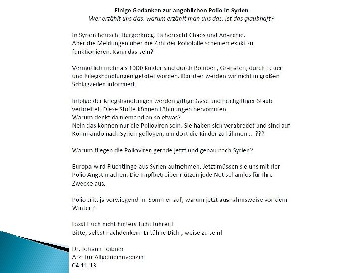 Film � „Wir impfen nicht! Mythos und Wirklichkeit der Impfkampagnen“ https: //www. youtube. com/watch? v=ZVh 4 Qa. Dm. XB 8 von Michael Leitner (dt. Journalist, Buchautor, Filmemacher UND Impfkritiker) "Impfungen stören die natürlichen Regelkreisläufe des Organismus. " (Dr. med. Georg Kneißl)