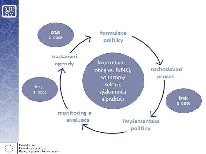 Odbor rodinné politiky a politiky stárnutí Oddělení politiky stárnutí MPSV Projekt Oddělení politiky stárnutí „Implementace politiky stárnutí na krajskou úroveň“ se zaměřuje zejména na: • systémovou a metodickou podporu rozvoje aktivit zaměřených na institucionální zajištění politiky přípravy na stárnutí na národní, krajské a místní úrovni v návaznosti na strategický dokument Národní akční plán podporující pozitivní stárnutí pro období let 2013 – 2017. • Oblast přípravy na stárnutí je dosud upravena prostřednictvím národní koordinační strategie. • Cílem projektu je především formulace tezí státní sociální politiky v oblasti přípravy na stárnutí a (zejména metodická) podpora její implementace na úroveň vyšších územně samosprávných celků a následně rovněž na úroveň samosprávy (která je svou působností nejblíže občanům).