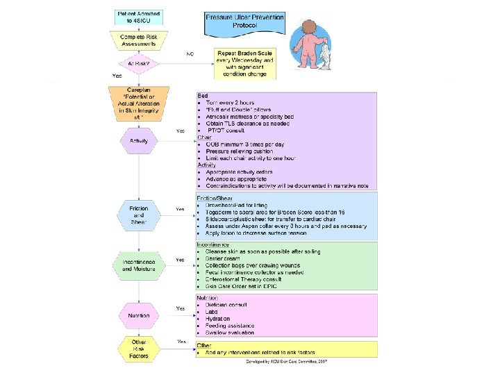 Aim Statement Reduction in the 4 SICU rate of nosocomial pressure ulcers by improving assessment of high risk patients and the implementation of evidenced based pressure ulcer prevention interventions Achieve 100% compliance in completing skin breakdown risk assessment on all 4 SICU patients by April 2007 Increase percentage of patients receiving all measures of pressure ulcer preventative care to 90% by April 2007 Maintain 4 SICU nosocomial pressure ulcer rate below NDNQI national mean for adult critical care units