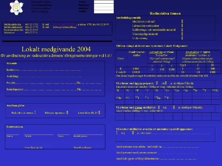 • Supervision and inspections Supervised work areas: Hospitals: -Radiology labs, inkl. external (thorax, cardio, surgery depts etc. ) -Nuclear medicine labs (diagn/therapy) -Radiation therapy treatment rooms; external and brachy) -Blood irradiation labs University: -X-ray research labs