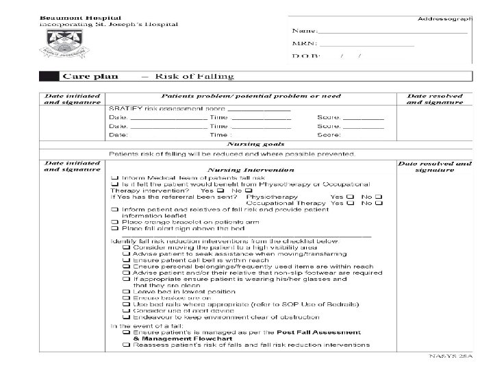 Risk of Falling Care Plan designed by the group �Individualised for each patient ◦ Documented date of assessment and reassessment ◦ Prompted alerting medical team of risk ◦ Referral to HSCP ◦ Identify the necessary interventions to be undertaken to ensure risk reduction.