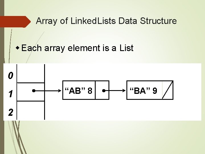 Array of Linked. Lists Data Structure w Each array element is a List 0 1 2 “AB” 8 “BA” 9