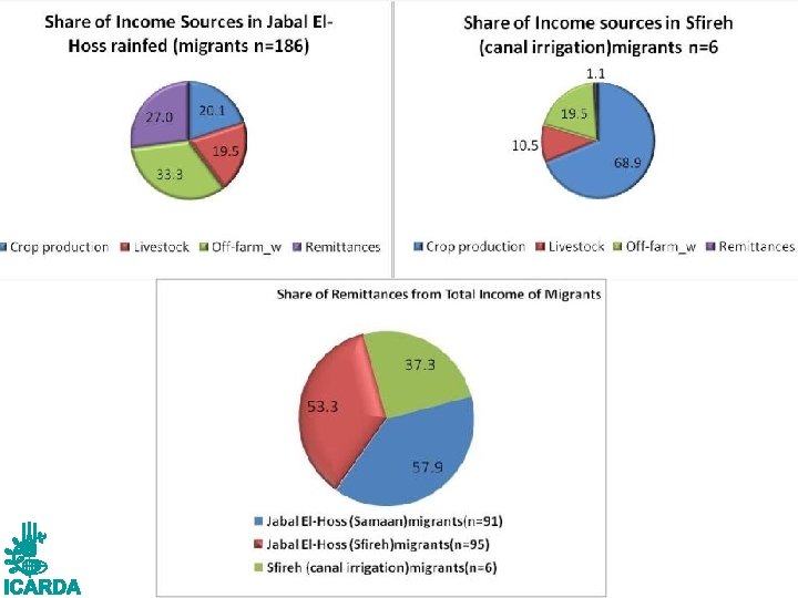 DEFINITION: Migrants are HH members who lived outside home for work for any period of time over the last 12 months (continuous or non-continuous). • • • Daily commuting is not considered as migration, but considered as off-farm work; Permanent migration/ relocation is not considered Internal migration: • Rural-urban migration • Rural-rural migration External Migration: • Neighboring countries (Lebanon, Jordan) • OTHER COUNTRIES (Saudi Arabia, Cyprus) International Center for Agricultural Research in the Dry Areas Types of Migration