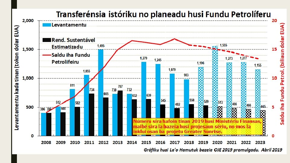 KONKLUZAUN Mezmu hetan billaun $10 husi mina no gas maibé too ohin loron Governu seidauk seriu atu mantein sustentabilidade ba fundu tanba nafatin iha esperansa no konfiansa ba dependensia ba riku mina no gas ne’ebé ladún iha rezerva barak. maibé kustu ba investimentu hotu presiza hasai tokon no billaun barak, nune’e nafatin presiza iha analiza klean ba kustu, benefisiu no risku husi projetu ida ne’e. komponente ida ne’ebé bele mak sei iha prosesu kontrusaun naruk mak planta LNG ne’ebe lori diskusaun no preukupasaun oin-oin husi entidade, kompañya inklui mos La’o Hamutuk Bainhira hare ba esperiensia husi nasaun seluk hatudu katak projetu ida ne’e fo ameasa boot ba nasaun liu-liu iha rai produtivu sira no ambiente. Gasta osan barak ba projetu, iha planu sei deve no tenke selu osan inklui osan funan. Governu Timor-Leste presiza asegura fundu petroliferu ne’ebé iha nune’e bele foka ba setor hirak ne’ebé bele fo benefisiu direta ba ema hotu nia moris no mantein sustentabilidade ba fundu. Bainhira kolia kona ba Sustentabilidade finansa estadu signifika bainhira iha investimentu ne’ebé laos deit iha possibilidade hetan lukru; maibé mos atu agesura sustentabiliade finansa presiza mos konsidera setor seluk