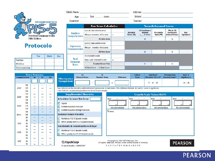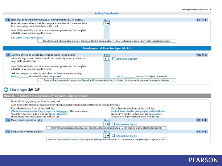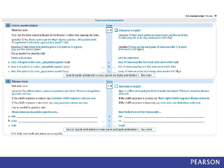 PLS– 5 Spanish Dual Language Standardization Study: Overview Field Research • PLS-5 Spanish Standardization edition – Items were administered in Spanish first – Any items missed in Spanish were re-administered in English Scoring • Items were scored based on: – Spanish performance – Spanish-English performance (dual language scoring) Data Analysis • Data analysis compared Spanish scores to Spanish-English scores