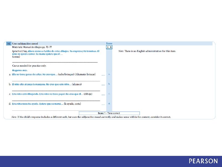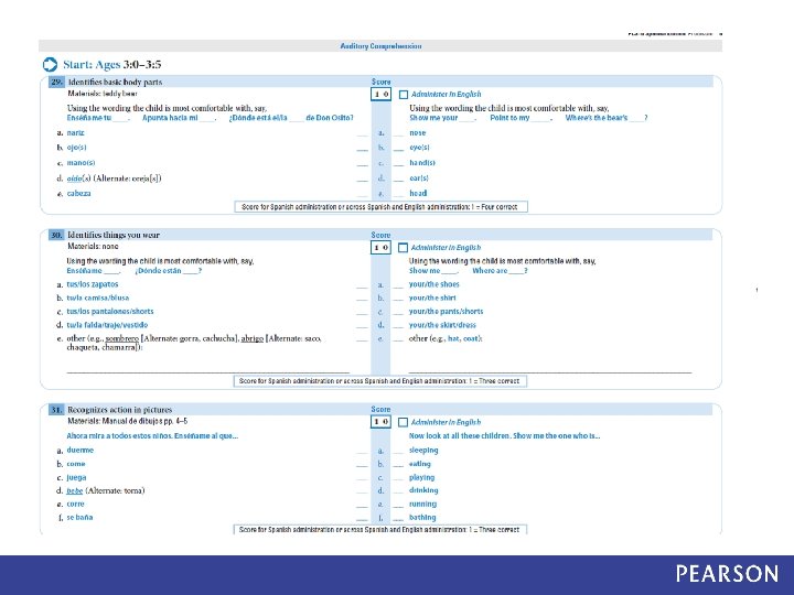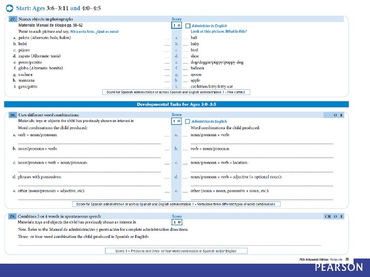 PLS– 5 Spanish Bilingual Tryout Study Method • PLS-5 Spanish Tryout edition • Items were administered in Spanish first • Any items missed in Spanish were re-administered in English • Items were scored based on: • Spanish performance • Spanish-English performance (dual language scoring) • Data analysis compared Spanish-only scores and Spanish. English scores