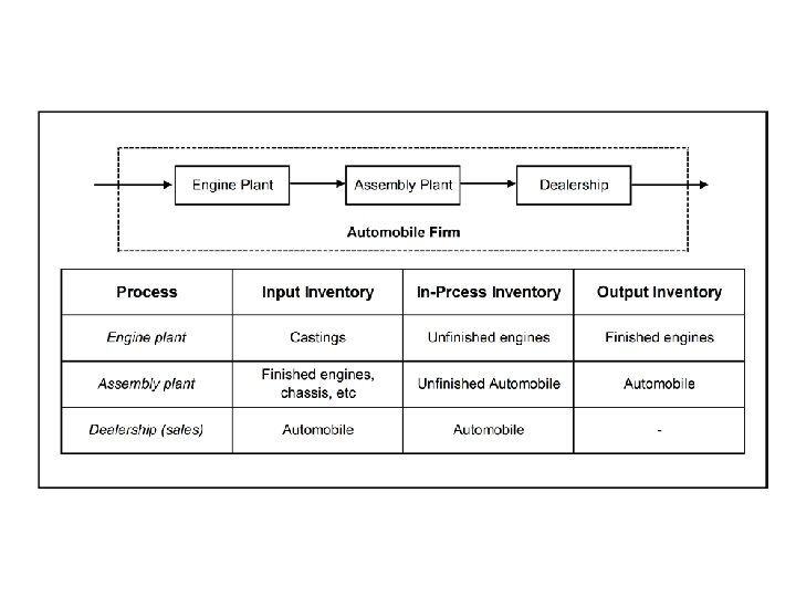 Inventory Classified Inputs Inventory – Flow units that are waiting to begin process • Raw materials In-process inventory – Flow units that are being processed • Transformation of goods and materials Outputs Inventory – Processed flow units that have not yet exited the system • Finished Product In Transit Inventory – Flow units that are in transit to a final destination