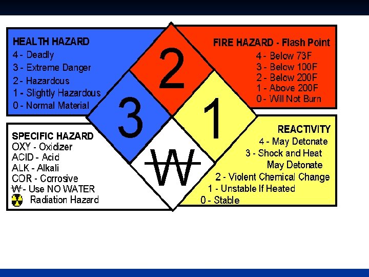 n 4 – May detonate n 3 – Shock and heat may detonate n 2 – Violent chemical change n 1 – Unstable if heated n 0 – Stable