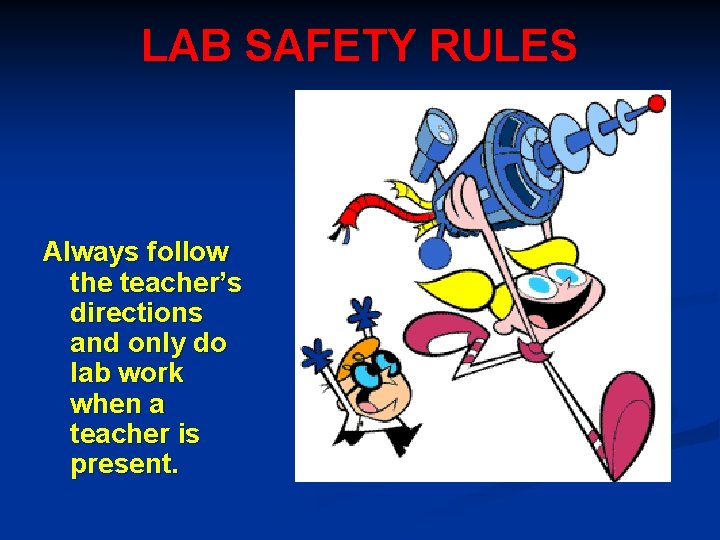 LAB SAFETY RULES Always follow the teacher’s directions and only do lab work when a teacher is present.