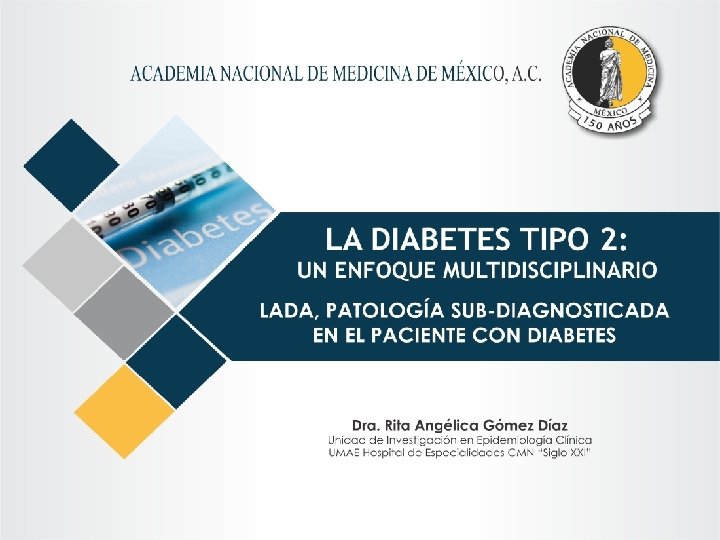 Conclusiones ü En México, se desconoce la prevalencia de LADA en los pacientes que inician la diabetes antes de los 40 años de edad. ü Para evitar un error de diagnóstico, es importante primero la evaluación fenotípica del paciente, y si es posible, la determinación de autoanticuerpos. ü Hasta la fecha hay insuficiente información sobre el desarrollo de complicaciones en los pacientes con LADA. ü Se requiere más ensayos clínicos controlados que evalúen el manejo adecuado en pacientes con LADA.