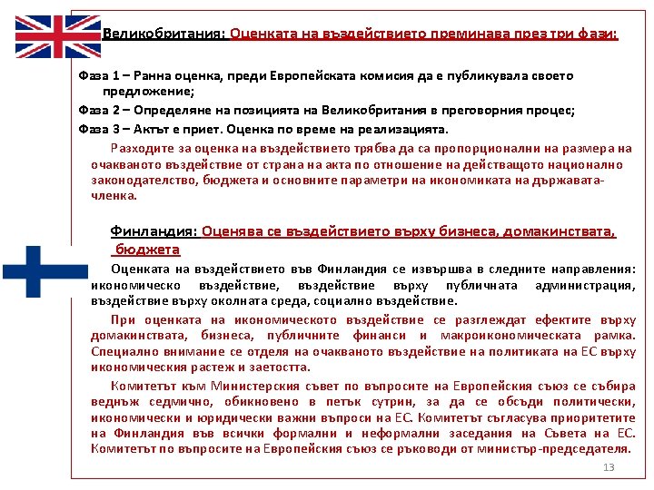 UK: Impact assessment goes through three phases Phase 1 – Early assessment, before the European Commission publishes its legal proposal; Phase 2 – Determining UK position in negotiating process; Phase 3 – After approval of the proposal. Assessment in the period of implementation. The expenditures for impact assessment should be proportionate to the size of the expected impact from the act in terms of national legislation, the budget and the main parameters of the economy of the Member State. Finland: Assessment of impact on business, households, budget Assessing the impact of EU legal acts in Finland is carried out in the following areas: economic impact, impact on public administration, environmental impact, social impact. The assessment of the economic impact addresses the effects on households, businesses, public finances and macroeconomic framework. Special attention is given to the expected impact of the EU policies on economic growth and employment. The Cabinet Committee on European Union Affairs meets once a week, usually on Friday mornings, to discuss politically, economically and legally important EU affairs. The Cabinet Committee on European Union Affairs agrees on Finland's priorities in all formal and informal Council meetings. The Cabinet Committee on European Union Affairs is chaired by the Prime Minister. 14