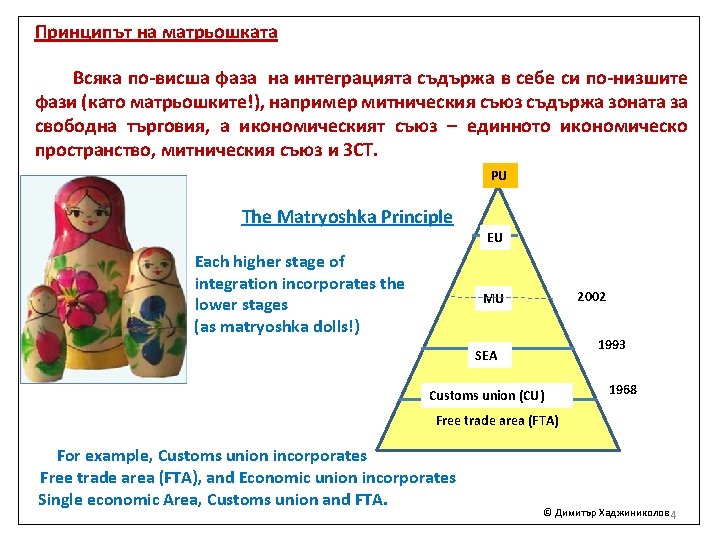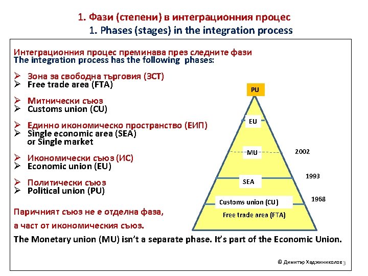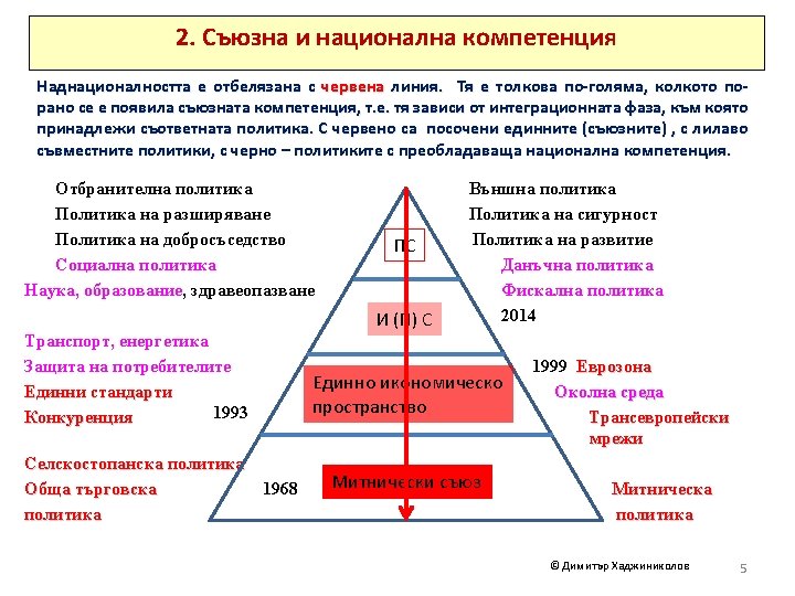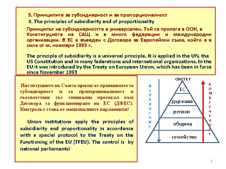 2. Union and national competency Supranationality is marked with the red line. The earlier the union competence has appeared, the stronger the supranationality is, i. e. supranationality depends on the integration phase to which the respective policy belongs. In red are marked the single (union) policies, in purple the joint policies and in black - policies with prevailing national competence. Defense policy Enlargement policy Neighborhood policy Social policy Science, education, health PU E (M) U Transport, Energy Consumer protection Single standards Competition Foreign policy Security policy Development policy Tax policy Fiscal policy 2014 Single Economic Area 1993 Agricultural policy Common commercial policy 1968 1999 Eurozone Environment policy Trans-European network (TEN) Customs Union Customs and Tariffs © Димитър Хаджиниколов 6