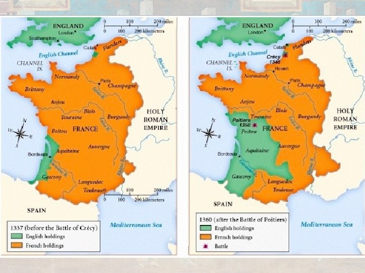 CRECY 1346 English army – ~14, 000(mostly longbowmen) French army – ~30, 000 (mostly knights and Genoese crossbowmen) Casualties: French – ~2, 000 – 4, 000 knights unknown common soldiers English – 100 - 300