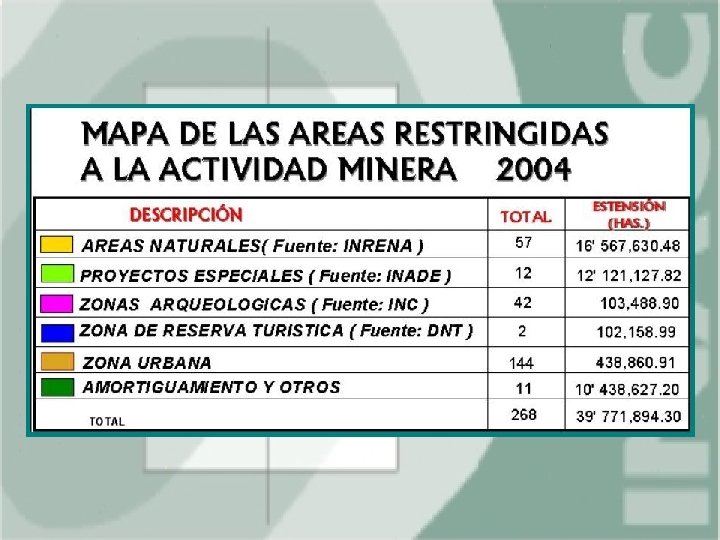 El Catastro de Áreas Restringidas a la Actividad Minera Esta conformado por las siguientes áreas : • • • Areas Naturales Protegidas Zonas Arqueológicas Proyectos Especiales Zonas de Reserva Turística Zonas Urbanas y de Expansión Urbana Otros