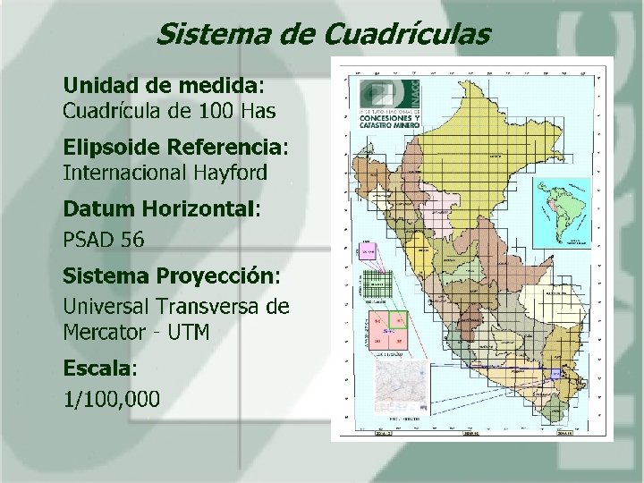 El Catastro Minero Es el inventario de derechos mineros en el ámbito del territorio nacional que consta de información alfanumérica, numérica y geográfica. • Concesiones mineras • Concesiones de Beneficio • Concesiones de labor general • Concesiones de Transporte minero