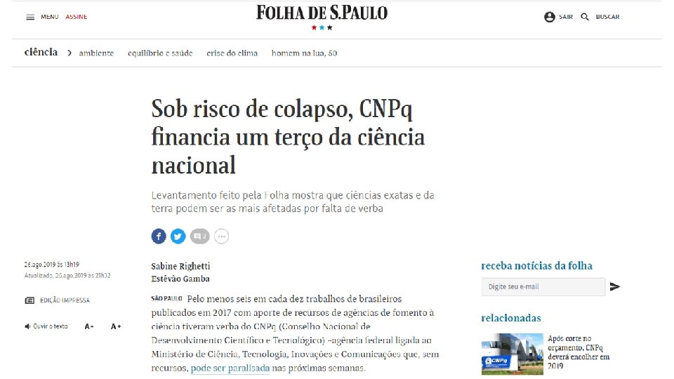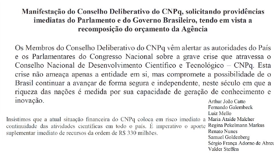 • Queremos a recomposição imediata do Orçamento do CNPq, em 2019, com um aporte suplementar de recursos da ordem de R$ 330 milhões para que ele possa cumprir os seus compromissos deste ano, em particular no pagamento das bolsas. • Conclamamos as instâncias decisórias do Executivo e do Legislativo Federal a reverterem imediatamente este quadro crítico de desmonte do CNPq e a colocarem também, no Orçamento de 2020, os recursos necessários ao funcionamento pleno do CNPq. • Consideramos inaceitável a extinção do CNPq, como 925. 000 assinaturas sinaliza este estrangulamento orçamentário e uma política para a CT&I sem compromisso com o desenvolvimento científico e econômico do País e com a soberania nacional. #somostodos. CNPq
