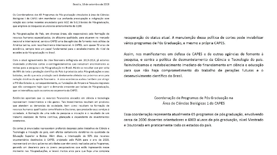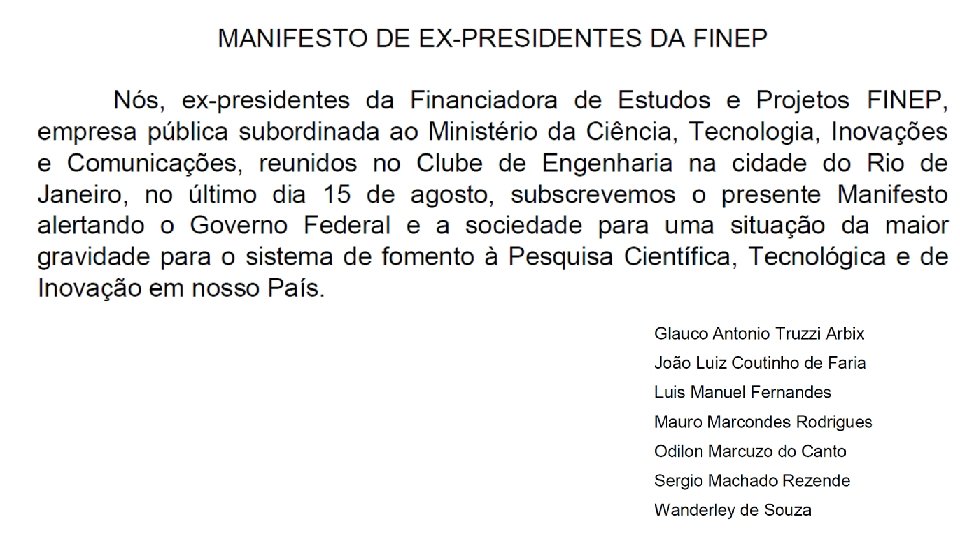 Esta petição tem apoio das seguintes entidades científicas e acadêmicas brasileiras: Associação Brasileira de Currículo (ABd. C) Sociedade Brasileira para o Progresso da Ciência (SBPC) Associação Brasileira de Educação a Distância (ABED) Academia Brasileira de Ciências (ABC) Associação Nacional dos Dirigentes das Instituições Federais de Ensino Superior (ANDIFES) Conselho Nacional das Fundações de Amparo à Pesquisa (CONFAP) Conselho Nacional das Fundações de Apoio às Instituições de Ensino Superior e de Pesquisa Científica e Tecnológica (CONFIES) Conselho Nacional das Instituições da Rede Federal de Educação Profissional, Científica e Associação Brasileira de Enfermagem (ABEN) Associação Brasileira de Engenharia de Produção (ABEPRO) Associação Brasileira de Engenharia e Ciências Mecânicas (ABCM) Associação Brasileira de Estatística (ABE) Associação Brasileira de Estudos da Defesa (ABED) Associação Brasileira de Estudos do Século XVIII (ABES XVIII) Tecnológica (CONIF) Associação Brasileira de Estudos Populacionais (ABEP) Fórum Nacional de Pró-reitores de Pesquisa e Pós-graduação (FOPROP) Associação Brasileira de Estudos Sociais das Ciências e das Tecnologias (Esocite. BR) Rede Brasileira de Cidade Inteligentes & Humanas Associação Brasileira de Física Médica (ABFM) Academia Internacional para o Desenvolvimento da Pesquisa em Turismo no Brasil Associação Brasileira de Linguística (ABRALIN) (ABRATUR) Associação Brasileira de Pesquisa em Educação em Ciências (ABRAPEC) Associação Brasileira das Instituições de Pesquisa Tecnológica e Inovação (Abipti) Associação Brasileira de Pesquisadores de Comunicação Organizacional e de Rela) Associação Brasileira de Antropologia (ABA) Associação Brasileira de Pesquisadores em Jornalismo (SBPJor) Associação Brasileira de Ciência Ecológica (ABECO) Associação Brasileira de Psicologia Política (ABCP) Associação Brasileira de Ciências Farmacêuticas (ABCF) Associação Brasileira de Cristalografia (ABCr) Associação Brasileira de Psicologia Social (ABRAPSO) Associação Brasileira de Relações Internacionais (ABRI)