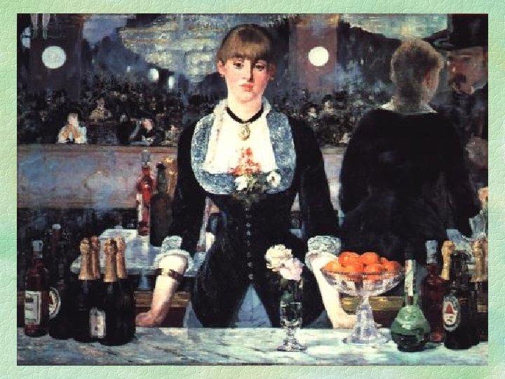 Édouard Manet § A Bar at the Folies-Bergère, 1881 -2, o/c, 37¾ x 51¼” l l A study in light, reflection, and color What is represented in this painting? • Who is the woman and where is she? • Who are the people around her? l What is the meaning of this work? • Does the artist have a message? • How does the painting make you feel?