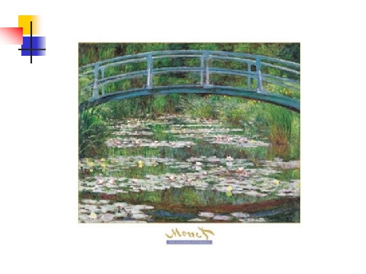Impressionismo - características n As cores e tonalidades não devem ser obtidas pela mistura das tintas na paleta do pintor. Pelo contrário, devem ser puras e dissociadas nos quadros em pequenas pinceladas. É o observador que, ao admirar a pintura, combina as várias cores, obtendo o resultado final. A mistura deixa, portanto, de ser técnica para ser óptica.