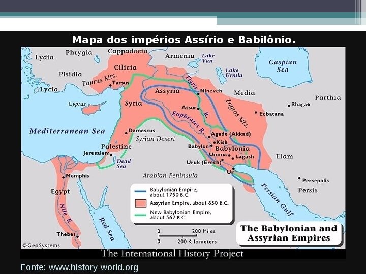 História da Assíria • Em 616 a. C, Nabopolassar, governador de Babilônia, declara a independência dos territórios sob sua jurisdição. Decidido a arrasar com o já minado poderio assírio, alia-se ao rei medo Ciaxares. Este, em 614 a. C, conquista e destrói totalmente Nínive, para onde Jonas fora enviado a proclamar os juízos do Eterno contra os reticentes filhos de Assur. • Com a queda de Nínive, desaparece a glória da Assíria.