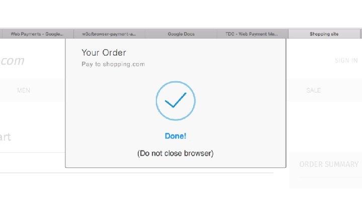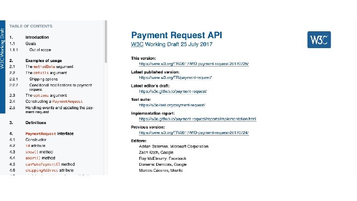 Payment Request API ● ● ● Methods: how to pay for things. Details: what is being bought. Options: things to complete transaction. Error handling: coarse-grained, fine-grained. Privacy preserving.