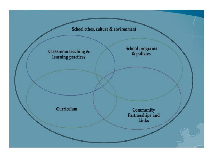 Whole school approaches to school improvement … ‘This generation of young people will also unavoidably be crucial decisionmakers in terms of stewardship of the earth. To be able to take an active part in sustainable development, students need to understand the concept of global interdependence, and need to value empathy, equity, personal responsibility, social justice and social action in their own lives and in their connections with the world’ (Tudball & Gordon, 2013, p 258) § Our obligation to learners of today is to develop curriculum relevant to their lives now and vital for a more sustainable future…
