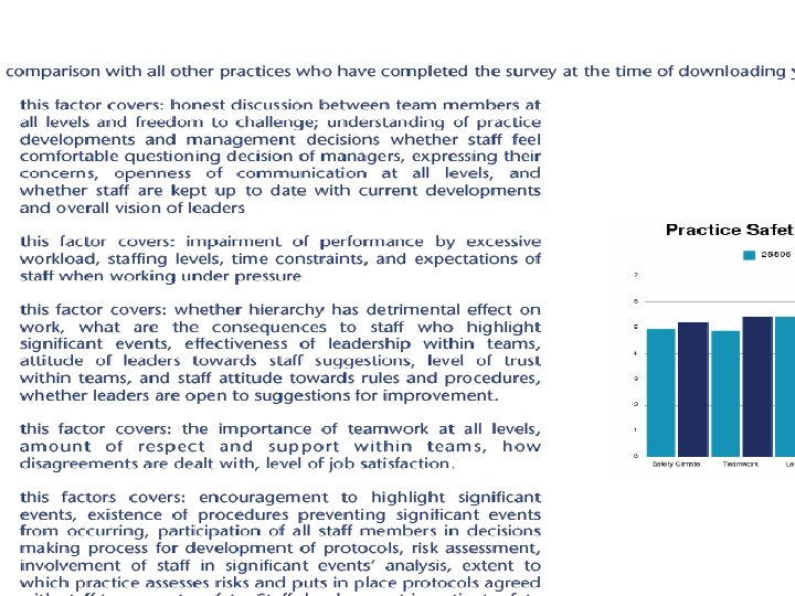 Key points The findings are for your practice teams (consider carefully though) • “Employees”/NHSB staff etc. Don’t get too focused on the numbers Concentrate on how you might use the results to “drive improvements” • Key issue • Emphasis on change/improvement, if needed