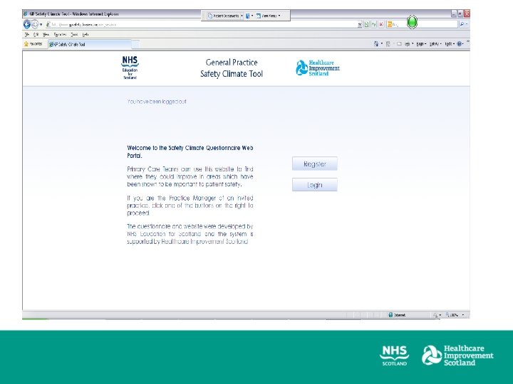 Relevant Links……. . • http: //www. healthcareimprovementscotland. org/our_work/patient_safet y/spsp_primary_care_resources/safety_climate_survey. aspx • Interpretation guides/FAQs/link to safequest • http: //www. sehd. scot. nhs. uk/pca/PCA 2013(M)02 guide. pdf • Qo. F 2013/14 Guidance, section 6 ii QI domain • http: //www. refhelp-borders. scot. nhs. uk/ • See Primary care/GP contract/Patient safety