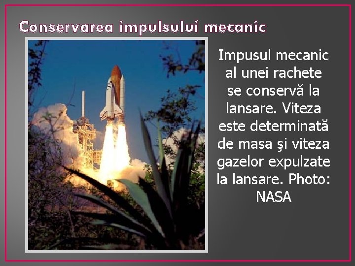 Conservarea impulsului mecanic Impusul mecanic al unei rachete se conservă la lansare. Viteza este determinată de masa şi viteza gazelor expulzate la lansare. Photo: NASA