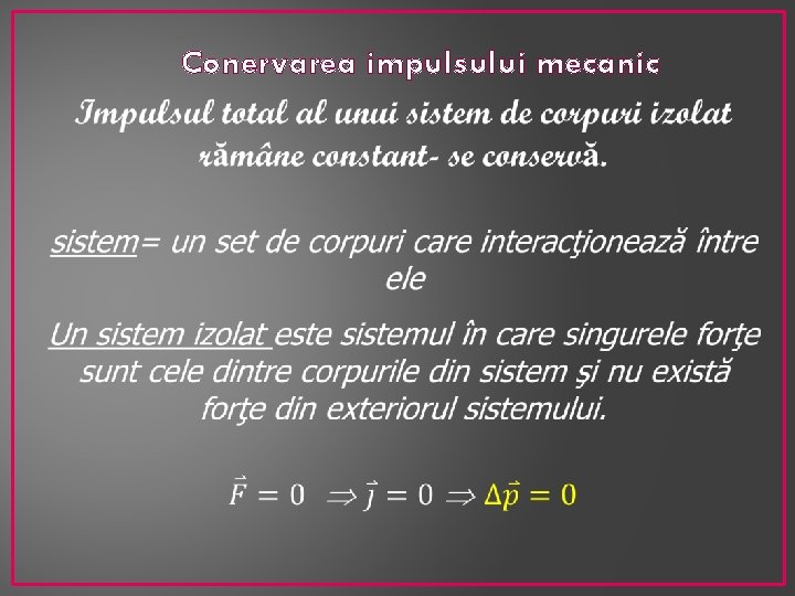 Obiective Definirea impulsul mecanic; Diferenţierea între impusul mecanic şi impusul forţei; Enunţarea teoremei conservării impulsului; Identificarea de situaţii reale în care se aplică conservarea impusului;