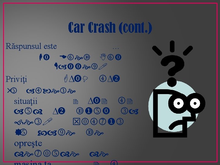 Car Crash (cont. ) Acum toată lumea să voteze Ridicaţi un deget dacă consideraţi că e mai bine să te loveşti de a doua maşină, două degete dacă consideraţi că e mai bine să te loveşti de zid, şi trei degete dacă spuneţi că nu contează. Şi răspunsul este…. .