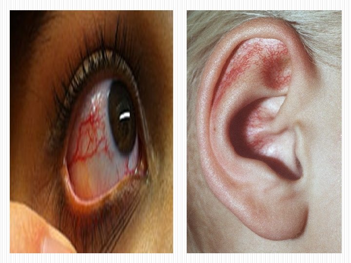 N Ataxia Telangiectazia: Genetic: Autosomal recesiv. Defect: ly T si Igs (Ig. A si Ig. G) sunt scazute. • Hipoplazia Timusului • Infectii Recurente: Sinuzita, si pneumonie (Ig. A scazut). • Risc crescut de leucemie & limfom. • Ataxia: probleme cu echilibrul. • Telangiectazia: dilatari ale capilarelor mici in conjunctive, urechi, fata. q