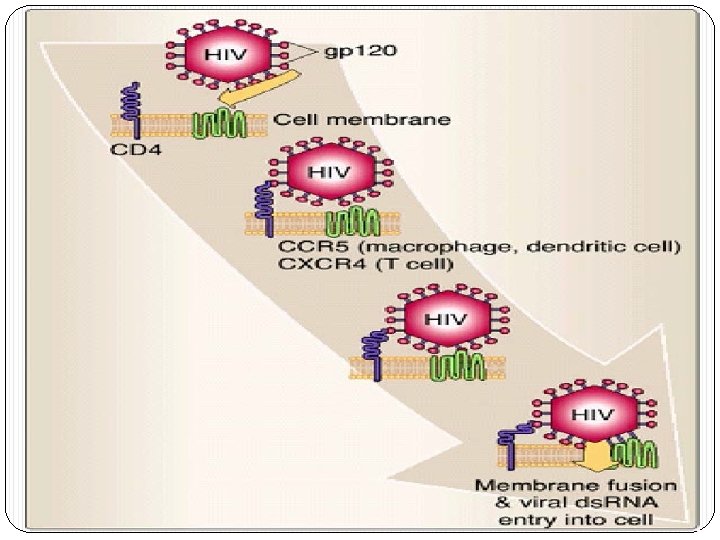 Tropism: Unele celule imune au o susceptibilitate specifica pt HIV datorita prezentei receptorilor specifici. § Receptor Major : CD 4 de pe celulele Th, macrofage si celulele dendritice § Co-receptori (receptori pt chemokine): �CXCR 4 pe cel. Th. �CCR 5 pe macrofage si celule dendritice