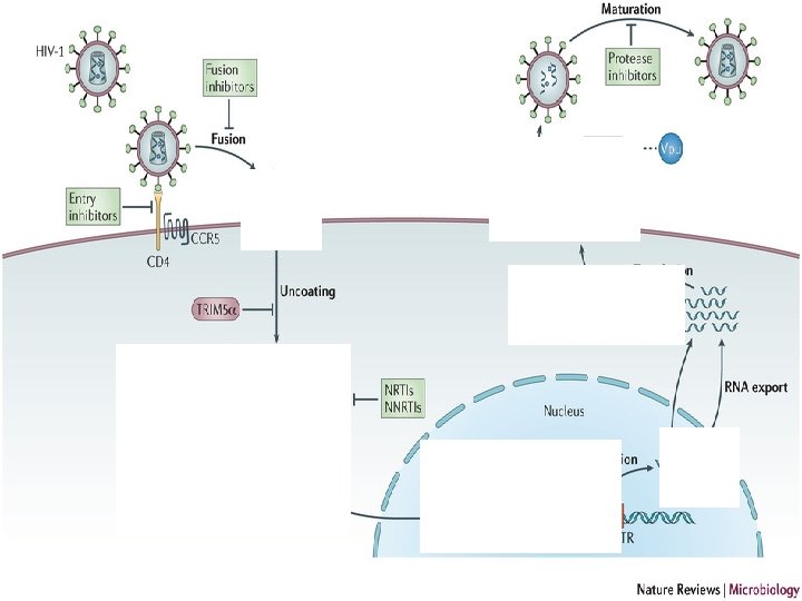 Replicarea § Atasarea (CD 4 apoi CCR 5 sau CXCR 4) § Intra si decapsuleaza § Formarea de ADN Ds si se integreaza. § Productia de componente ale virionilor apoi latenta. § Asamblarea si eliberarea prin inmugurire distrugind celula.