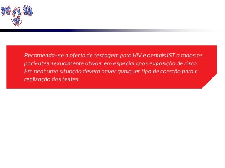 Diagnóstico • ELISA e derivados e teste rápido - Triagem - anti gp 120, anti gp 41 e antígeno p 24 • WESTERN-BLOT ou IFI - Confirmatório - anti gp 160, anti gp 120 anti gp 41, anti p 24, anti p 31, anti p 55 - alta sensibilidade - alta especificidade • Infecção recente - RT – q. PCR – cerca de 11 dias após infecção