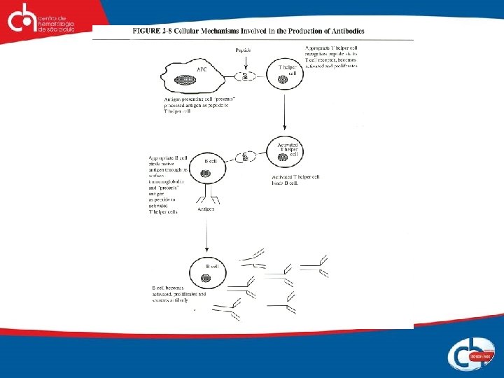 SÍNTESE DE ANTICORPOS n n Estimulação antigênica; 3 células envolvidas: linfócito B, linfócito T, CAA (célula apresentadora de antígenos); 1950 – Burnet – linfócitos não são produzidos por estímulo antigênico – milhões de linfócitos pré-programados. 1º passo: Reconhecimento Ag pela CAA – endocitose – entregue aos endossomas (proteólise limitada) – MHC classe II transportado pela cadeia invariante (proteína carreadora), do Complexo de Golgi para endossomas – ligação do peptídeo derivado Ag a molécula de MHC classe II, formando um complexo Ag/MHC classe II.